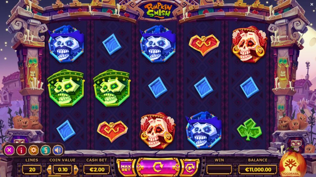 As you might expect from Yggdrasil, Pumpkin Smash is a visual feast for the eyes. This stunningly designed slot is full of colour and inspired by the Day of the Dead festival, which is perfect for Halloween. On the reels, there are a number of brightly coloured pumpkin and skull symbols that offer different payouts when landed on the reels. The reels themselves sit on a cute town square.
